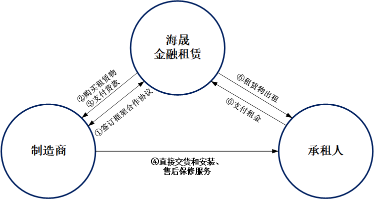 廠商租賃是設備制造商與海晟金融租賃結成戰略合作,利用融資租賃為購買其產品的客戶提供融資,并進行后續設備資產管理的業務形式。